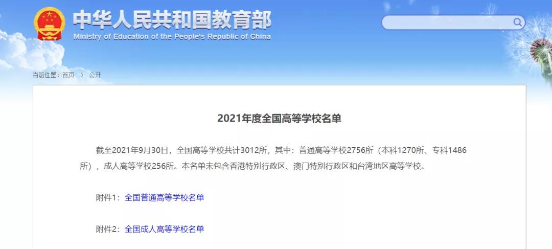近日,教育部發(fā)布了《2021年度全國高等學(xué)校名單》,截至2021年9月30日,全國高等學(xué)校共計(jì)3012所,其中:普通高等學(xué)校2756所(本科1270所、???486所),成人高等學(xué)校256所。本名單未包含香港特別行政區(qū)、澳門特別行政區(qū)和臺灣地區(qū)高等學(xué)校。