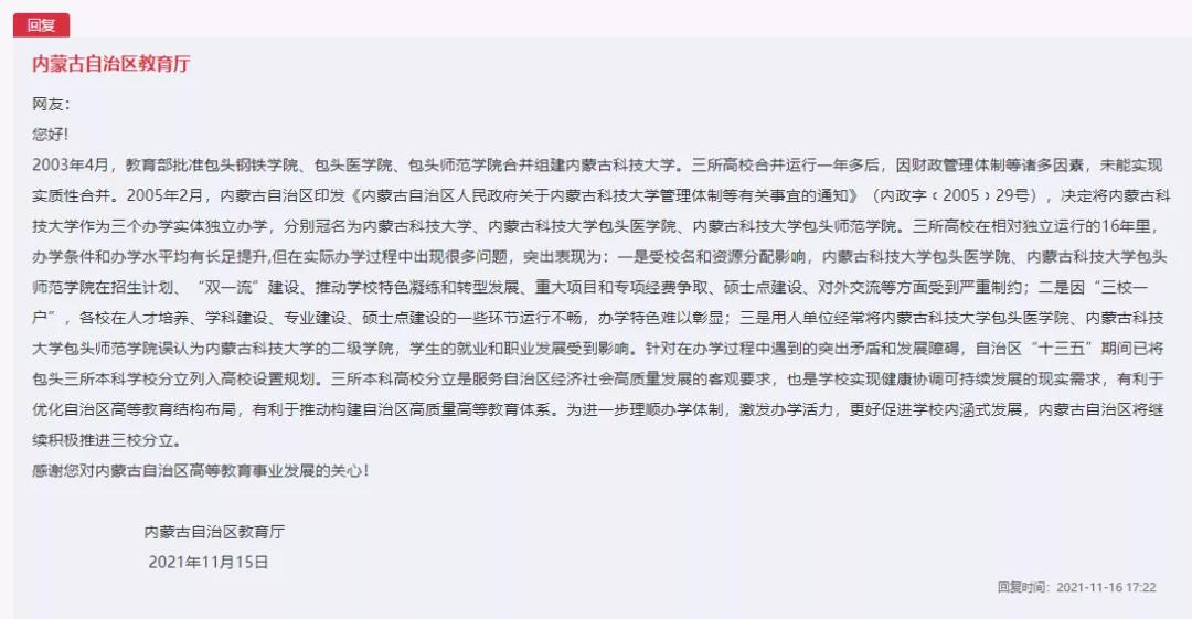 內(nèi)蒙古自治區(qū)教育廳回復(fù):